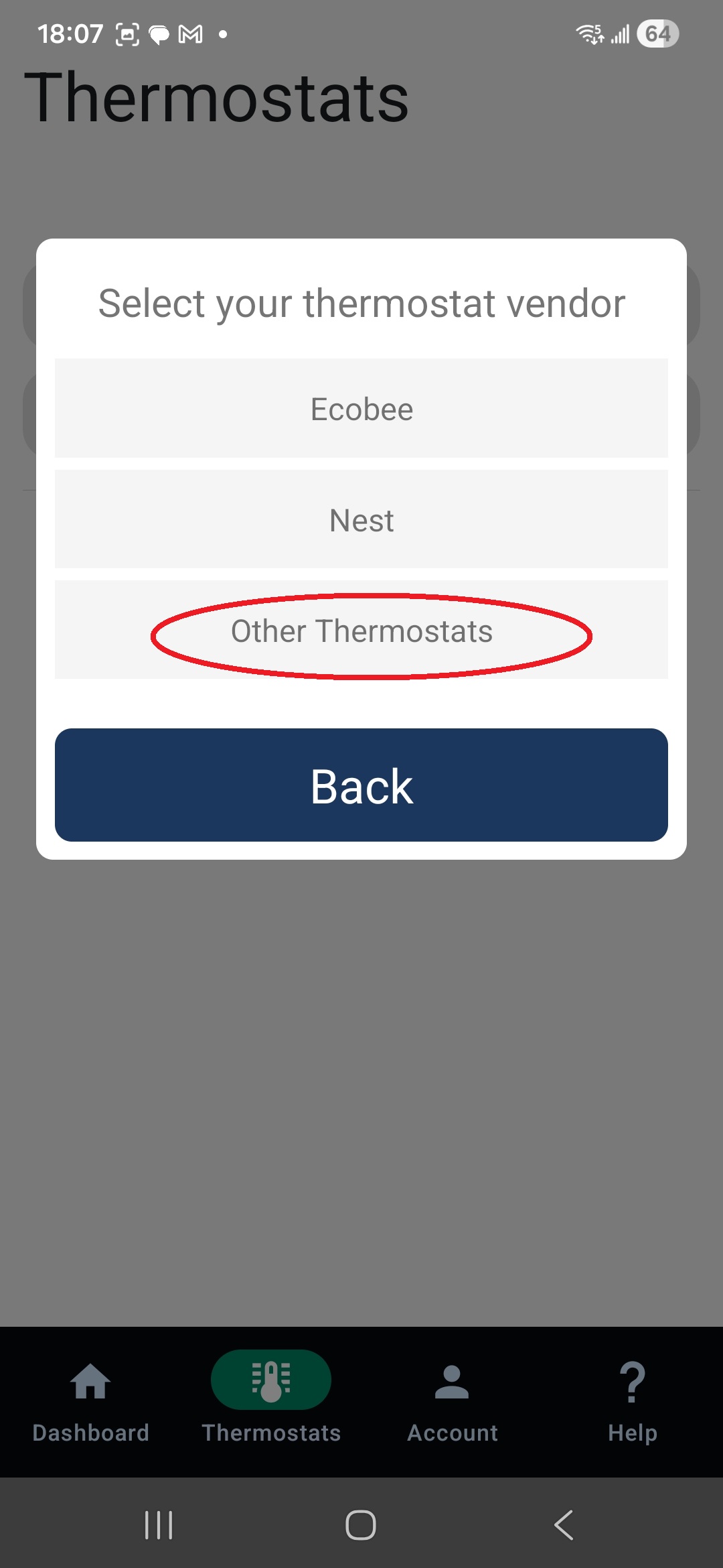 1. On the dashboard, tap “Thermostats”, then select “Connect Thermostat” and choose “Other Thermostat” to create a temporary (placeholder) thermostat.