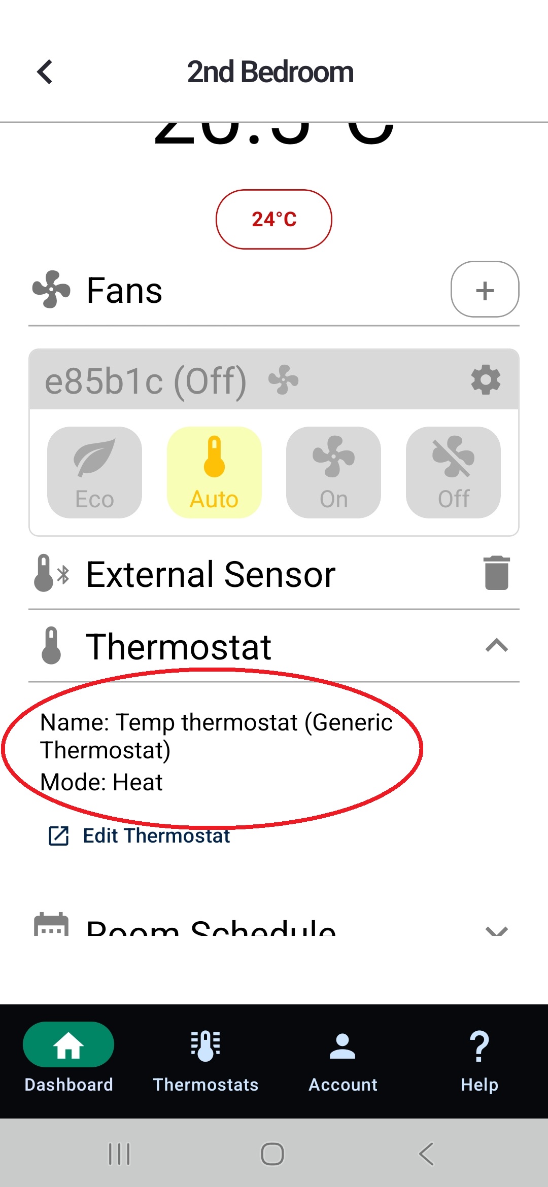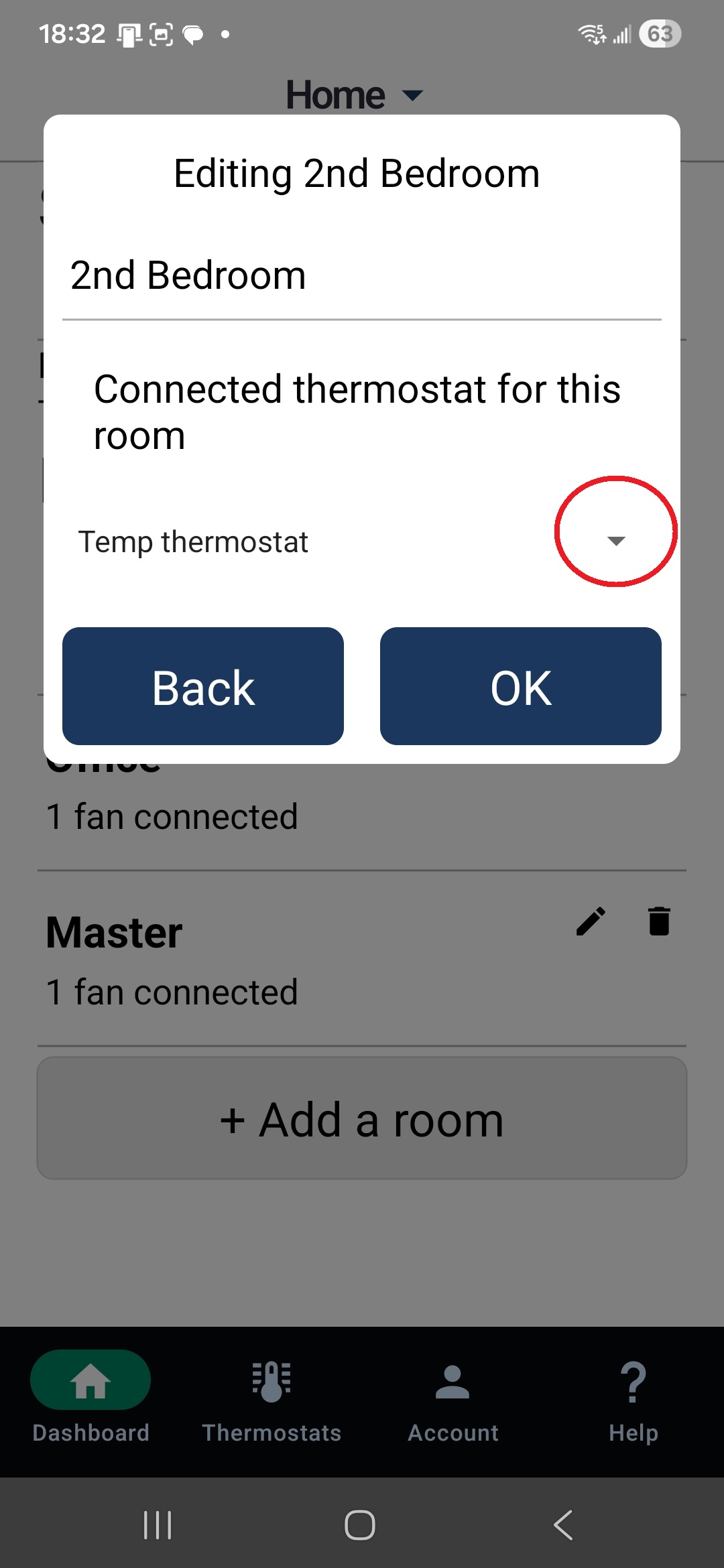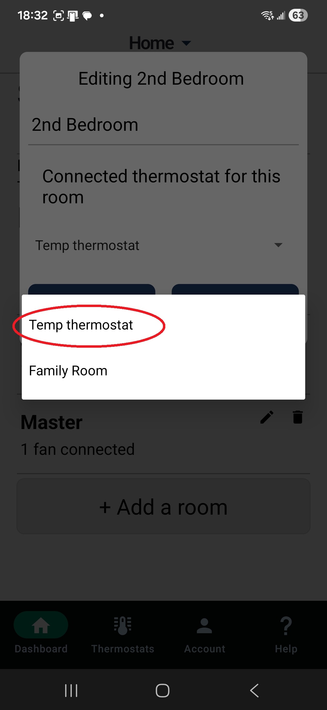 Once this is complete, click on each room, select the thermostat, and confirm that the room is now connected to the temporary thermostat you created.