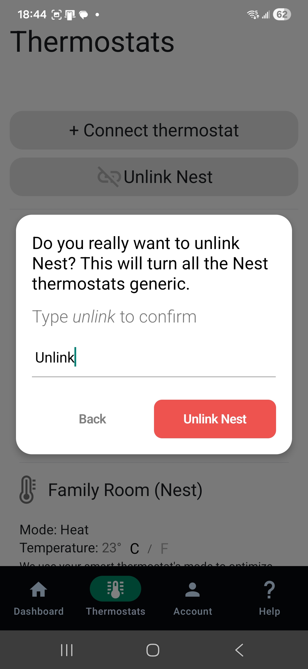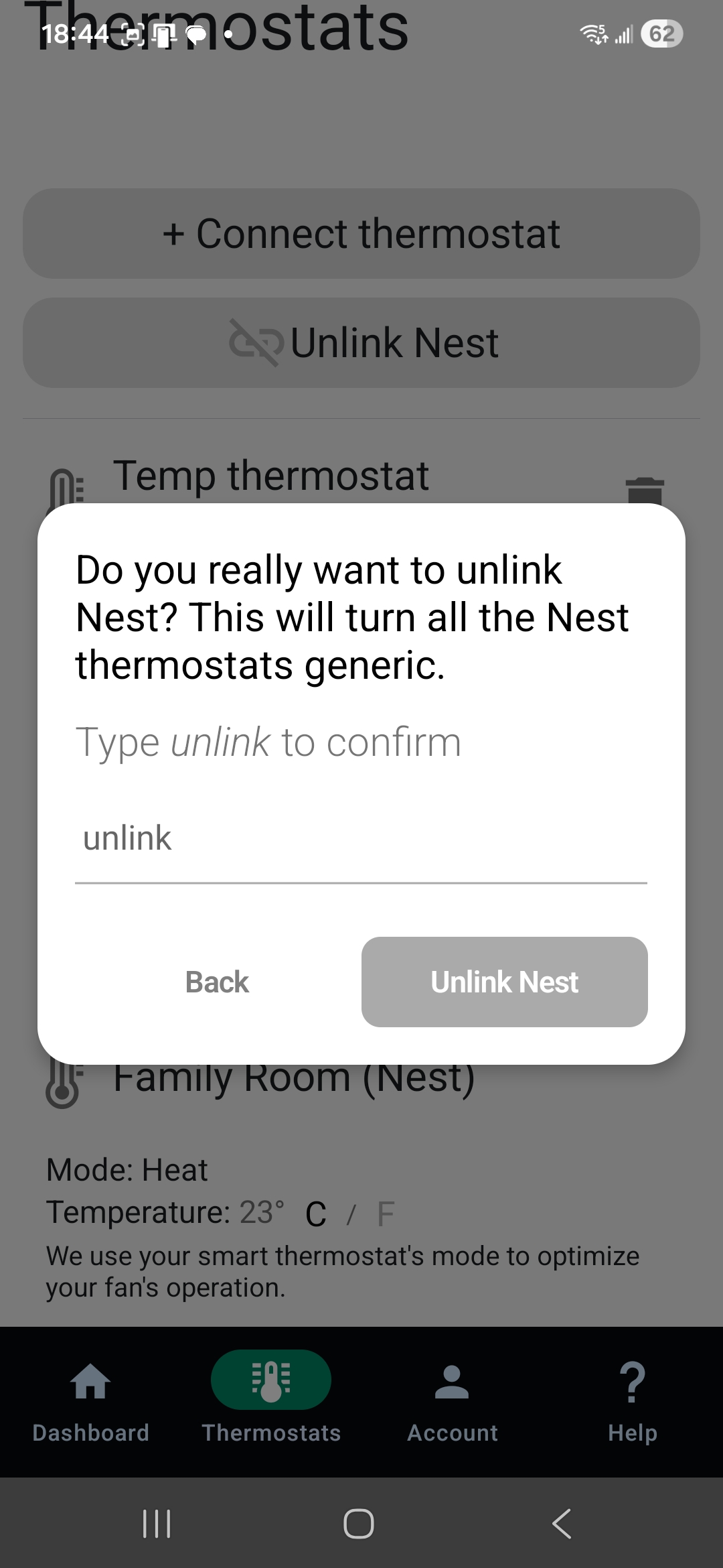 3. Once you’ve confirmed that all rooms are connected to the temporary thermostat, you can proceed to unlink your Nest thermostat.