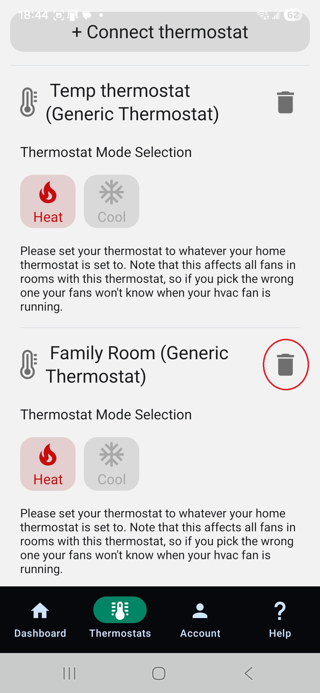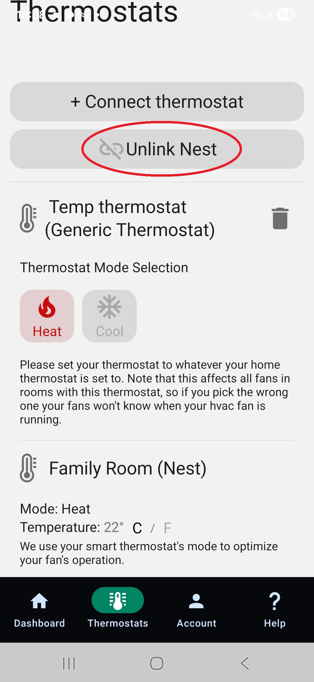 After unlinking, a trash can icon will appear next to the Nest thermostat, allowing you to delete it completely without deleting your fans.